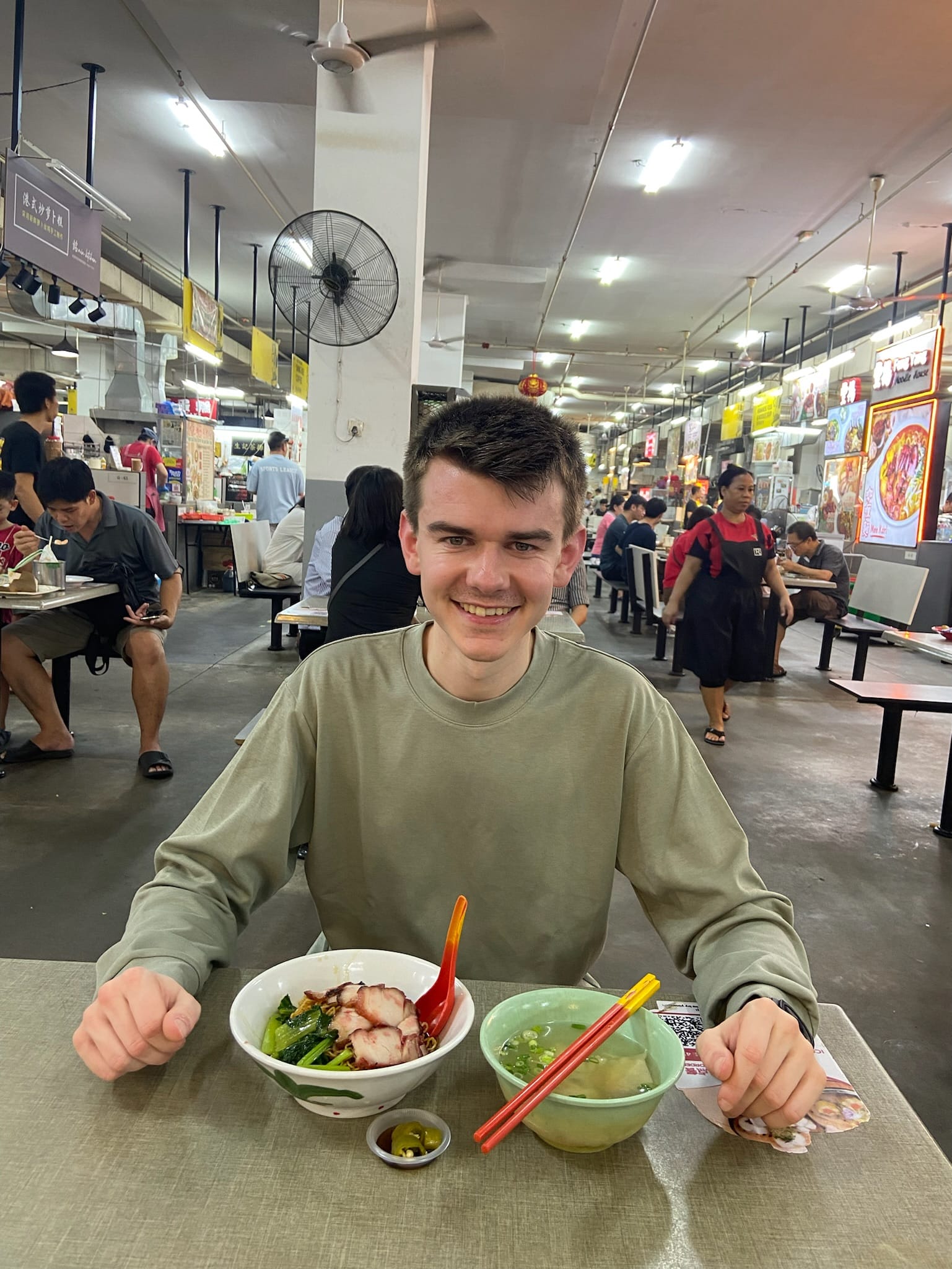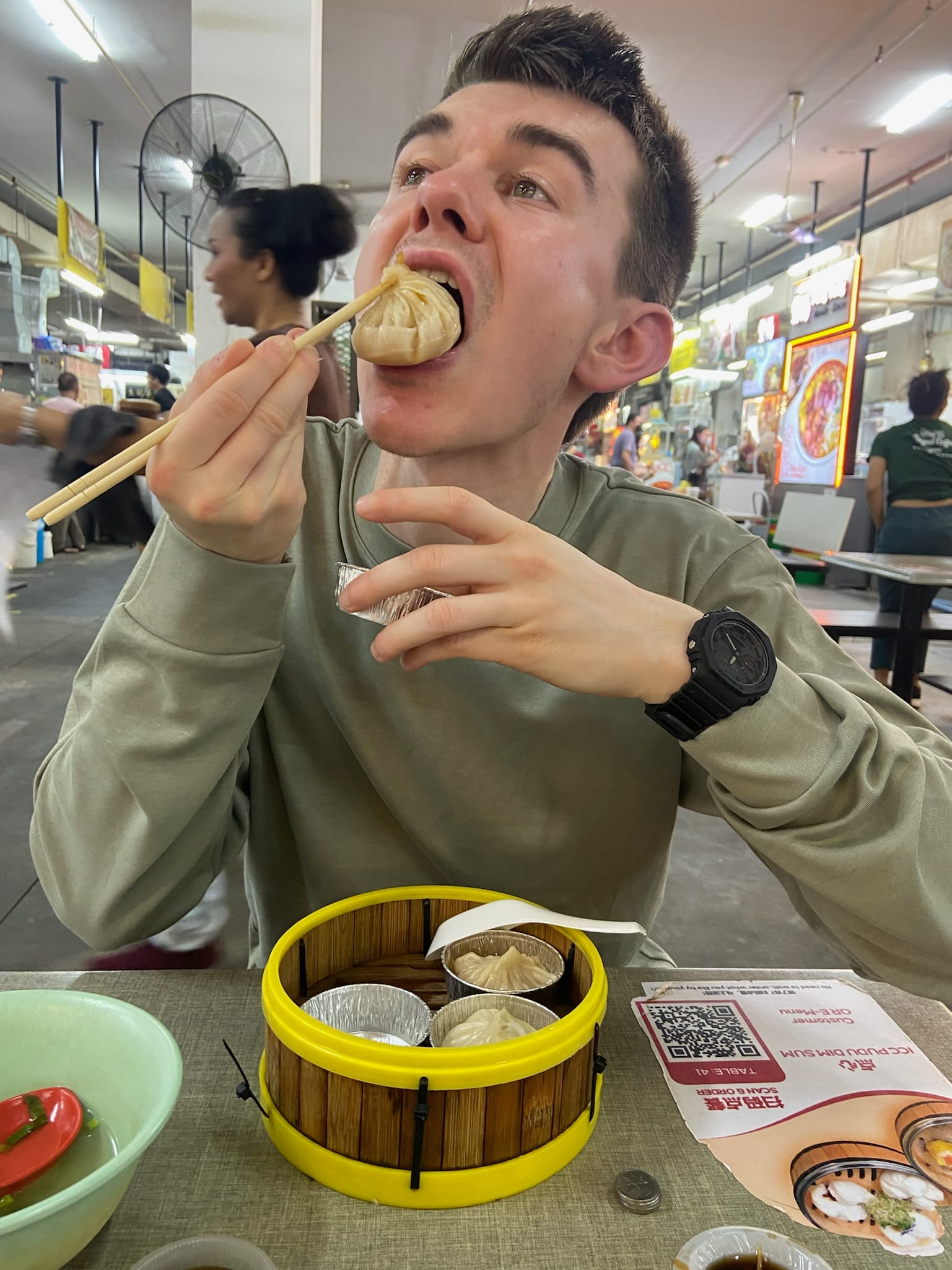 Breakfast of Xiao Long Bao, dumpling soup and pork with noodles from a Chinese street food market (ICC Pudu)! It was all delicious and only cost 22RM (£3.70).