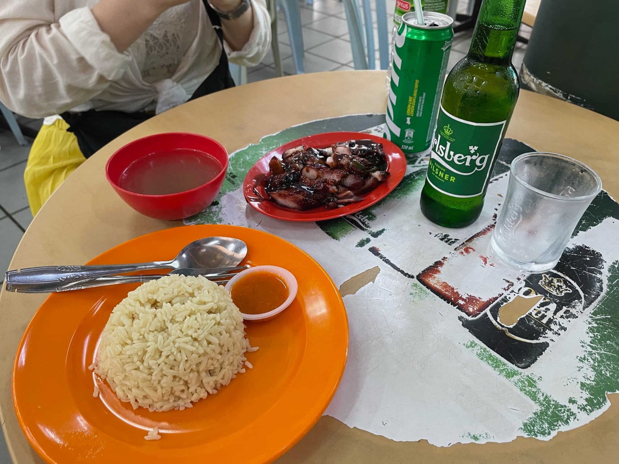 BBQ pork belly with rice from a stall in the market in Chinatown 15RM+15RM for drinks ~ £5 total. Beer seems relatively expensive in KL.