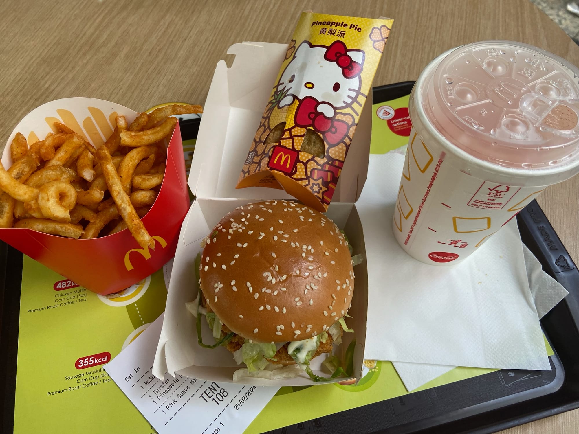 Our lunch: McSpicy, curly fries and guava mcfizz with pineapple pie from McDonalds and a curry puff (curry cornish pasty) from Old Chang Kee