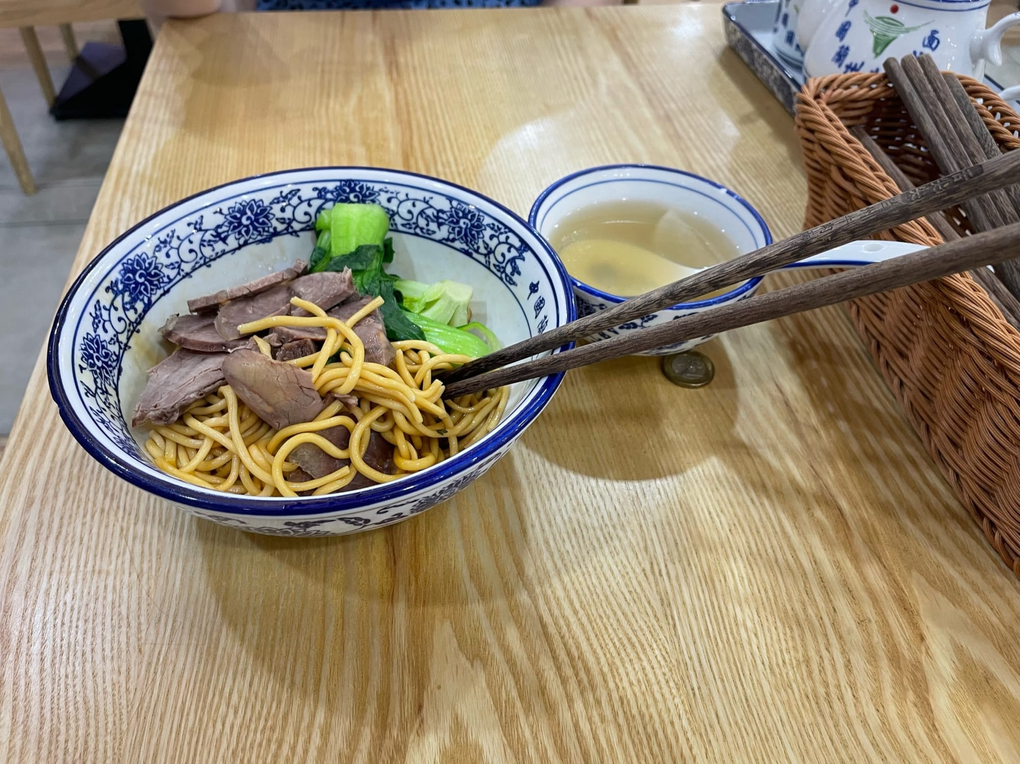 Lunch: freshly squeezed orange juice from vending machine and hand-pulled beef noodles. The orange juice was incredible but we were a little disappointed by the noodles.