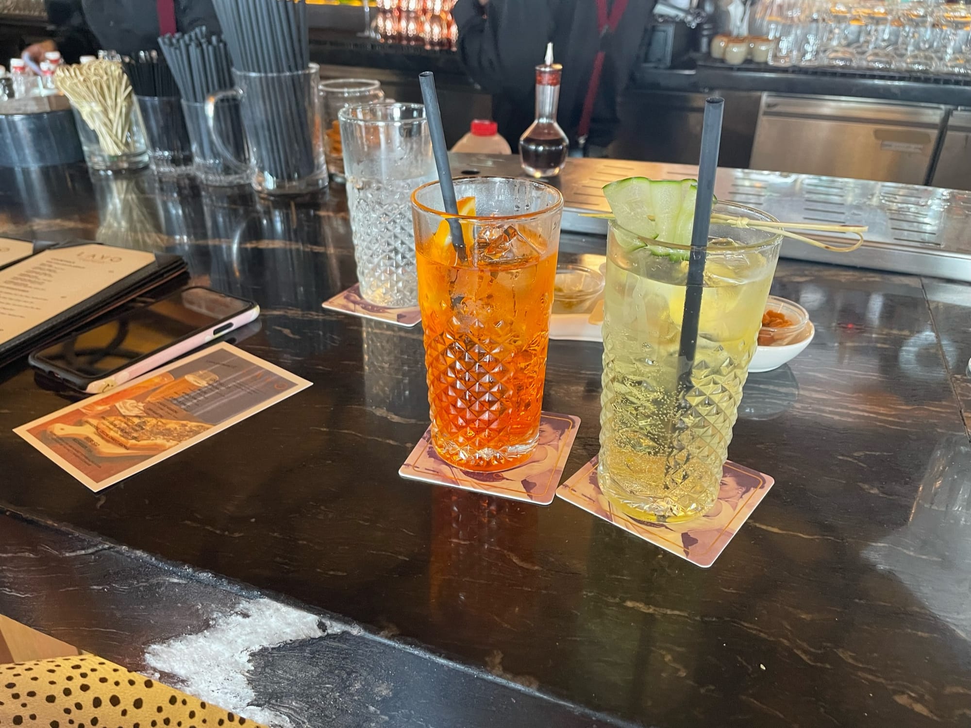 The bar area in Lavo (restaurant in Tower 1). We had an aperol spritz and a galliano gin and tonic (£30). We spent half the time watching the bartenders making various cocktails which they put so much effort in to (even chilling the glass and swirling a small amount of gin/vodka in the glass and chucking it away before serving the drink) and the other half walking around the perimeter looking at the view.