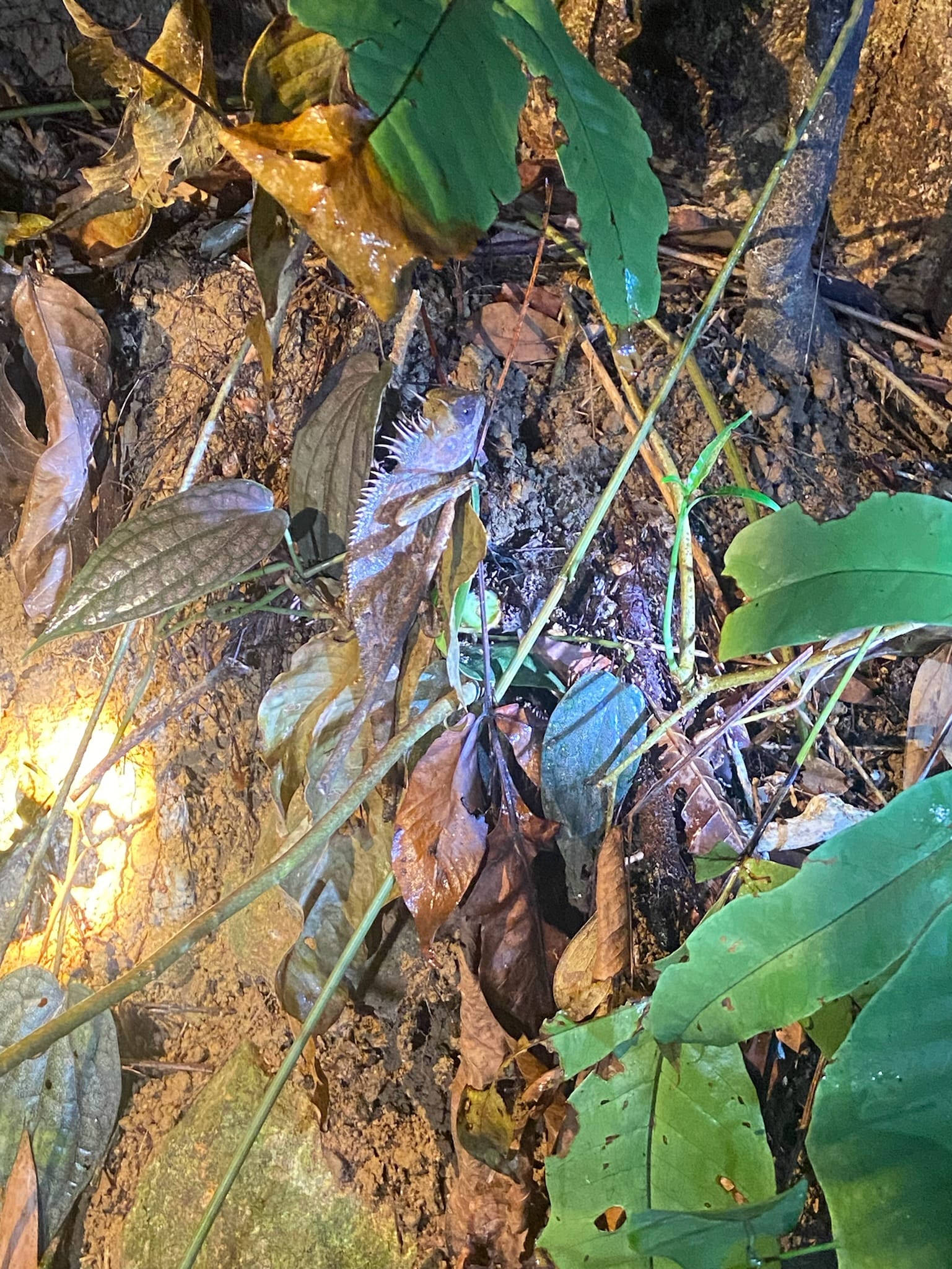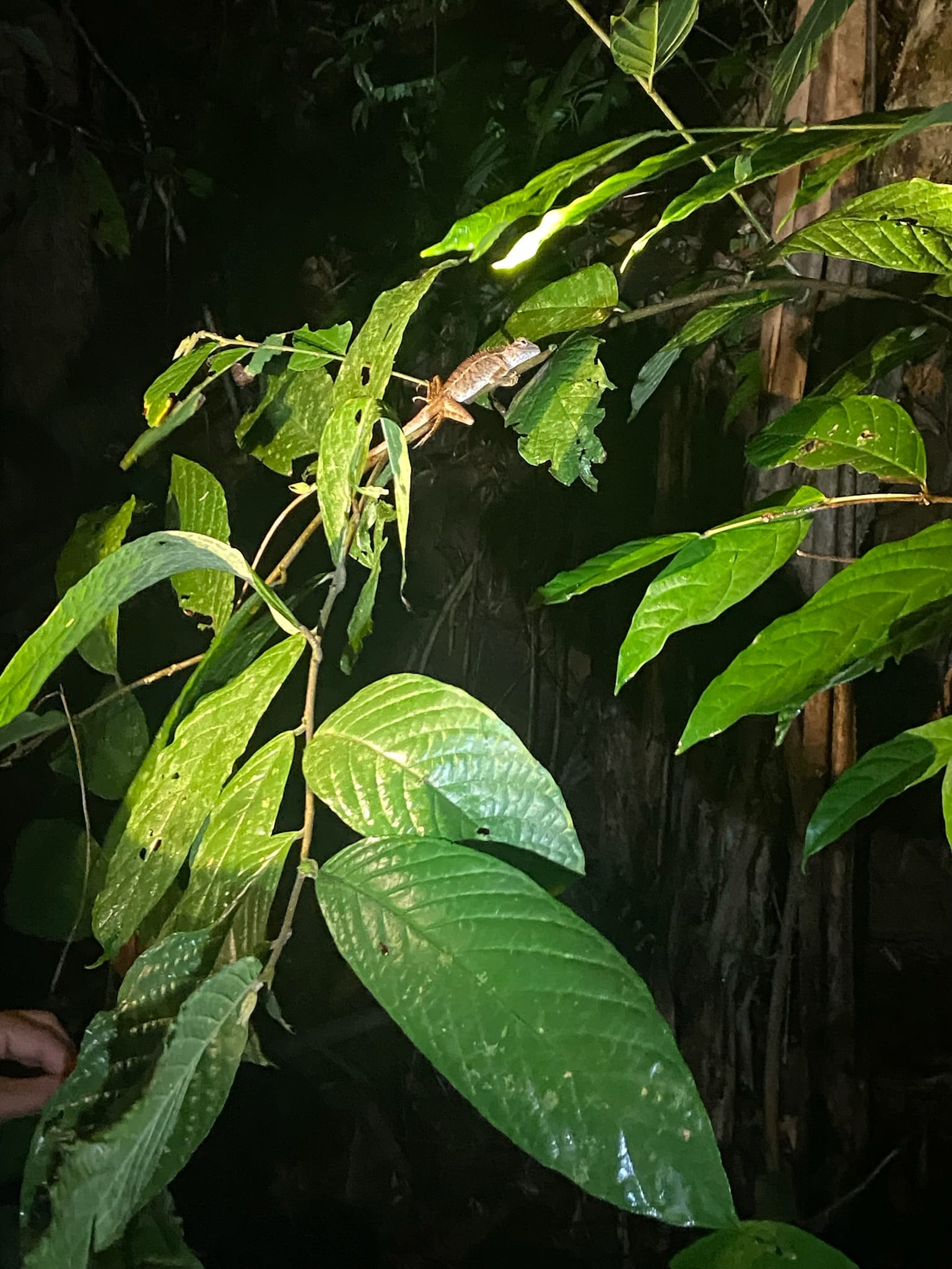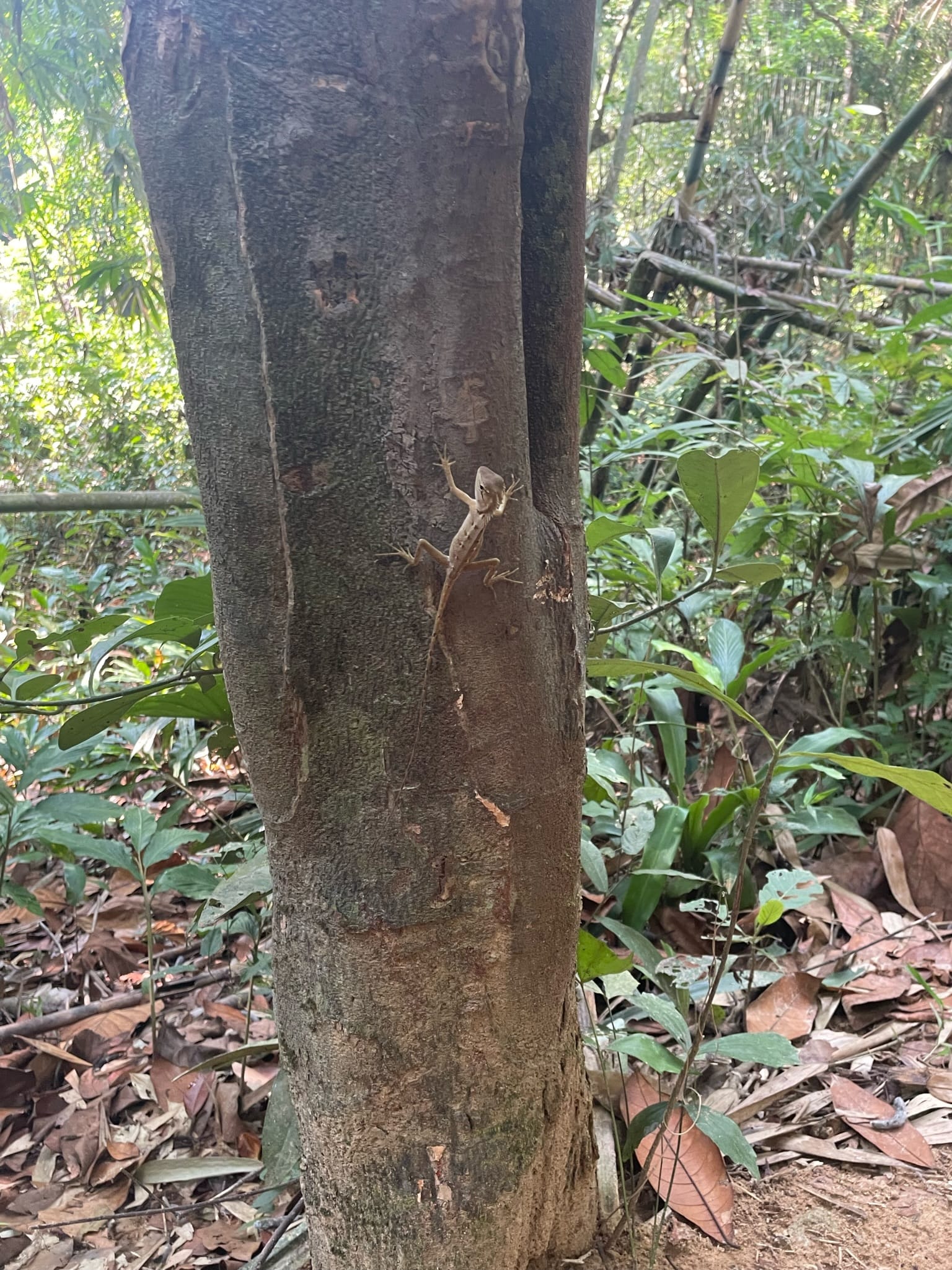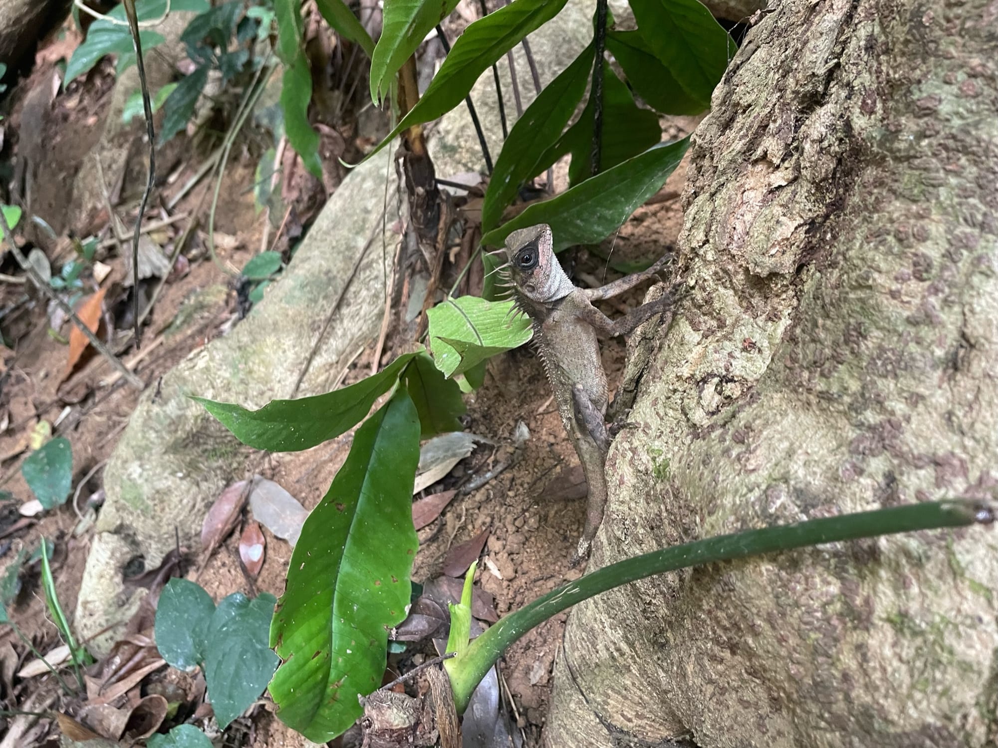 We were up and had breakfast early ready for our half-day hike around the jungle! The sounds and sights were very different to the day before, though the presence of elephants was still obvious, them having visited just the night before. The animal highlights were lizards, butterflies, giant tadpoles, fish, frogs, a snake and a pufferfish (which the guide enticed out of the water and neither of us realised had such sharp painful teeth). At one point, the guide quickly hugged a tree and we were quite confused until he came back with a lizard which uses webbed skin between its legs to glide between the trees - we quickly realised this was the same kind of flying lizard that we heard splatting on the floor the previous night.