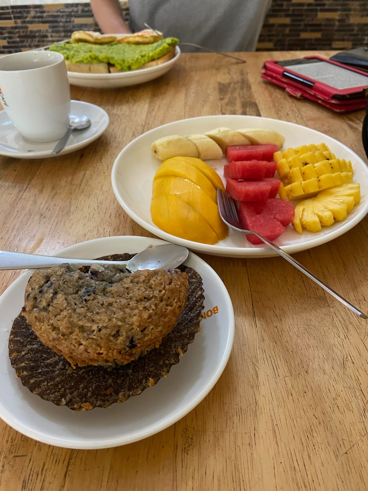 We walked back through the palm plantations after the class, nearly adopting a chihuahua on the way who would not stop following us until we got to a bigger scary looking dog. We went to get breakfast of a blueberry muffin and fruit for Lauryn and avocado and eggs set on toast for Dan and made friends which a guy from Martha’s Vineyard who asked to sit with us. After exchanging a few travelling stories, we parted ways and headed back to the hotel to pack up.