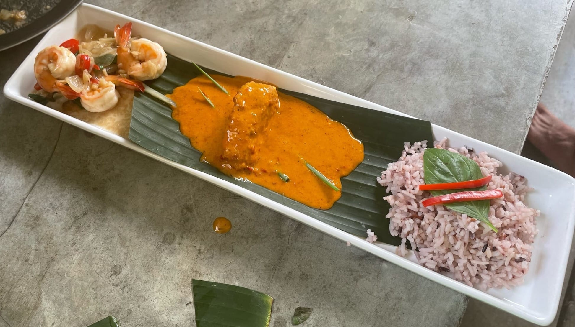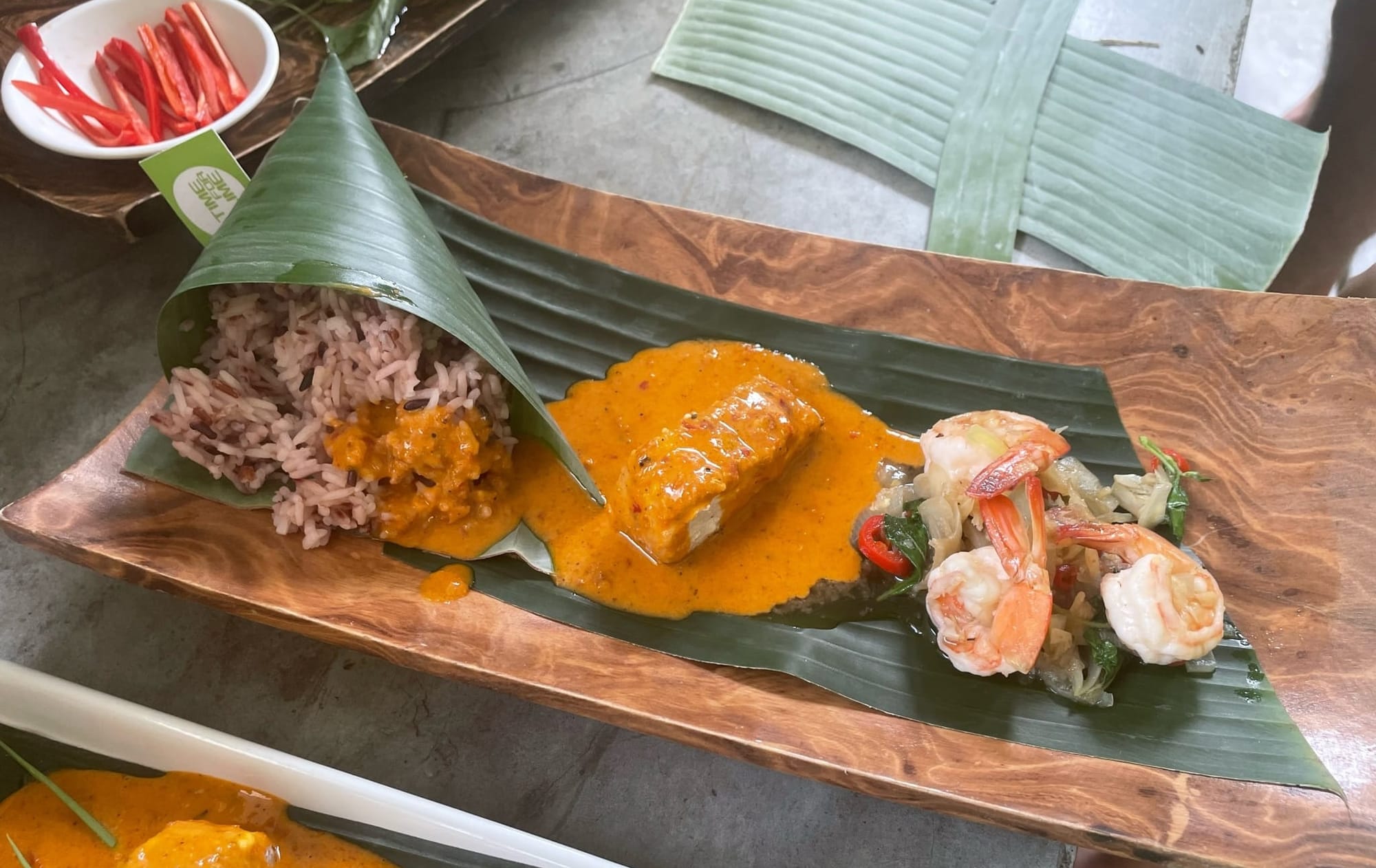 We then on to making the fish with red curry sauce and holy basil stir fry with prawns. We were shown sweet Thai basil and holy basil which tasted very different and think we may need to start growing at home. We also were taught how to make a thicker red curry sauce, which is an alternative to making the full soupy version. Making dishes look pretty is also very important in Thai cuisine, so we were taught techniques on how to fold and cut banana leaves to make our dishes look as good as they tasted (well, we tried to) - supply of banana leaves in Buxton/Liverpool may need some creativity if we try to replicate this at home though. Again, we then sat around with the group to enjoy our dishes and an espresso martini (but with a Thai twist of coconut milk) to wash it down with.