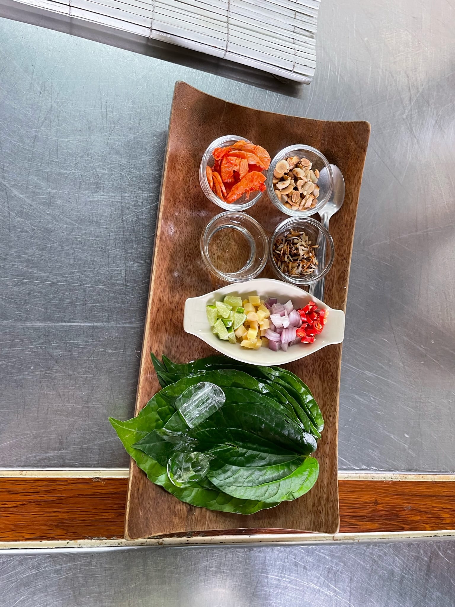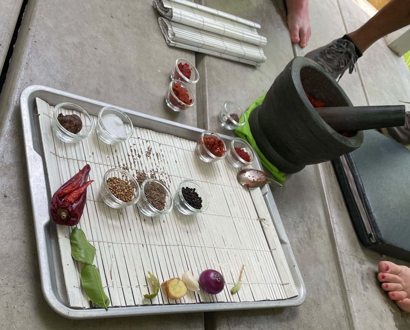 Next we learned the fundamentals of Thai cooking from Noi. We were asked to taste a concoction of wild pepper leaf with peanut, dried shrimp, coconut, lime, ginger, red onion, chilli and sugar syrup - it tasted incredible and a real explosion of flavours. We were talked through what we should always put together (like lime juice and fish sauce/soy sauce); when Thais prefer to use palm sugar aka coconut sugar rather than refined sugar and how to chop the various ingredients in an ‘eat me’ way or a ‘don’t eat me’ way. We then moved on to learn how to make a red curry paste using lemongrass, kaffir lime leaf, kaffir lime skin, galangal, garlic, onion, coriander root, dried hot chillis (spicy) and dried big chillis (less spicy but more colour and flavour), coriander seeds, cumin seeds, black peppercorns, shrimp paste and salt, all which was ground down in a pestle and mortar for 40 minutes. It was very different than the bought curry pastes which we have used at home. Noi also told us how you can make a big batch of the curry paste, put it in ice cube trays and then a ziplock bag and freeze it for up to a year.