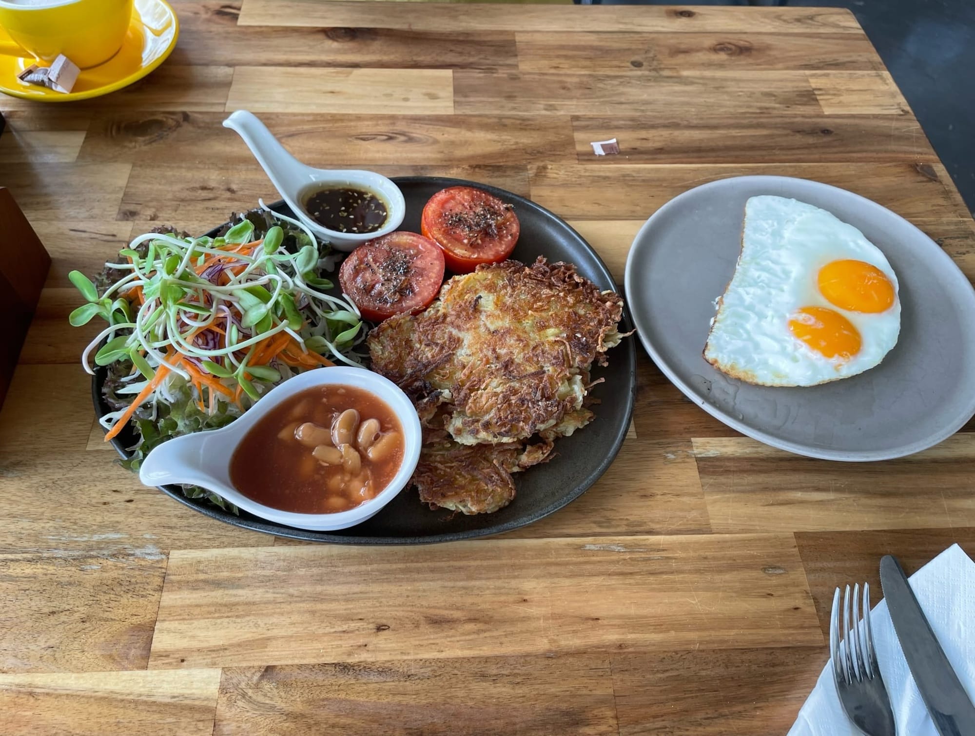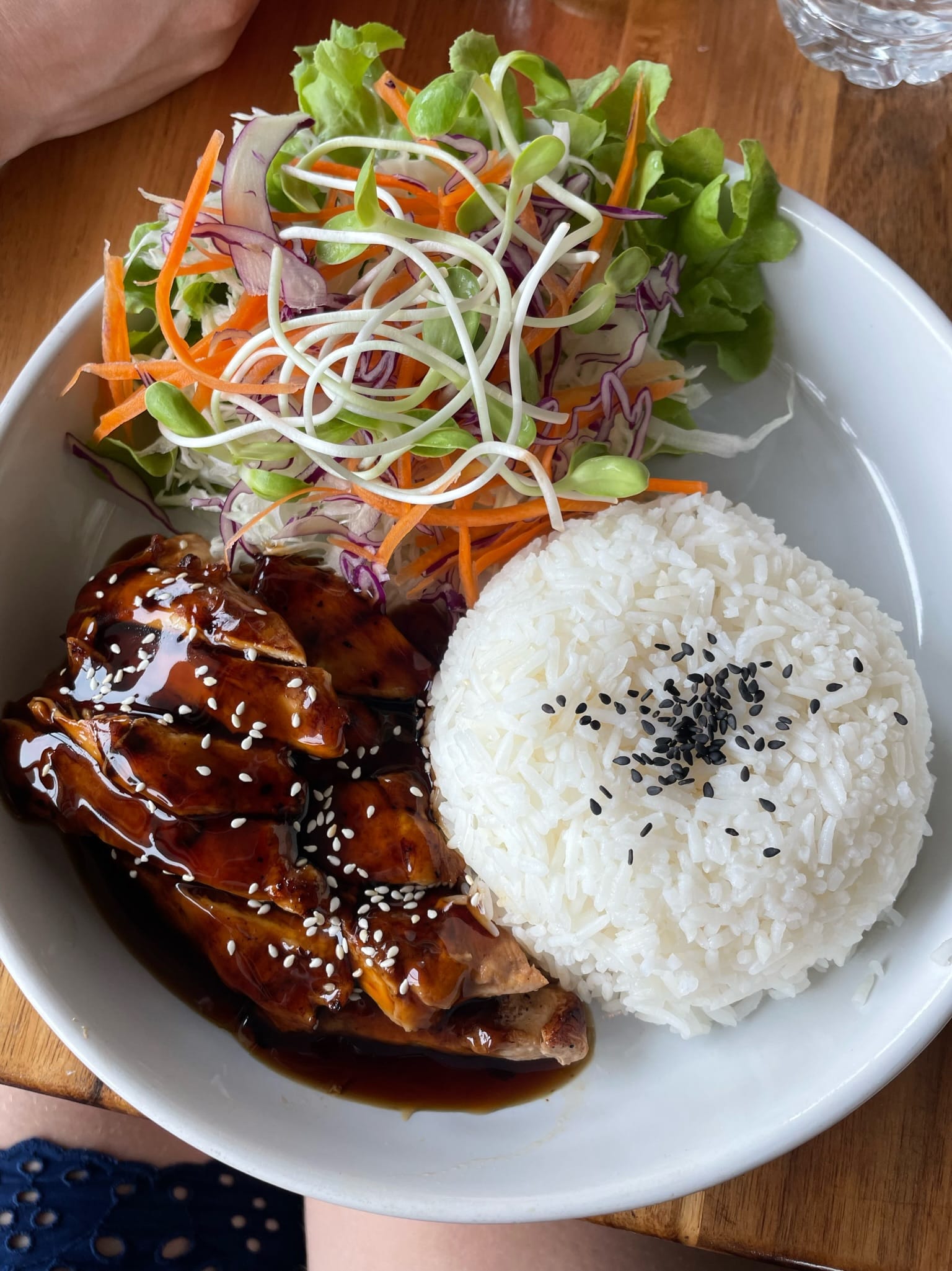 From Together Cafe: teriyaki rice bowl and vegan breakfast with side of eggs