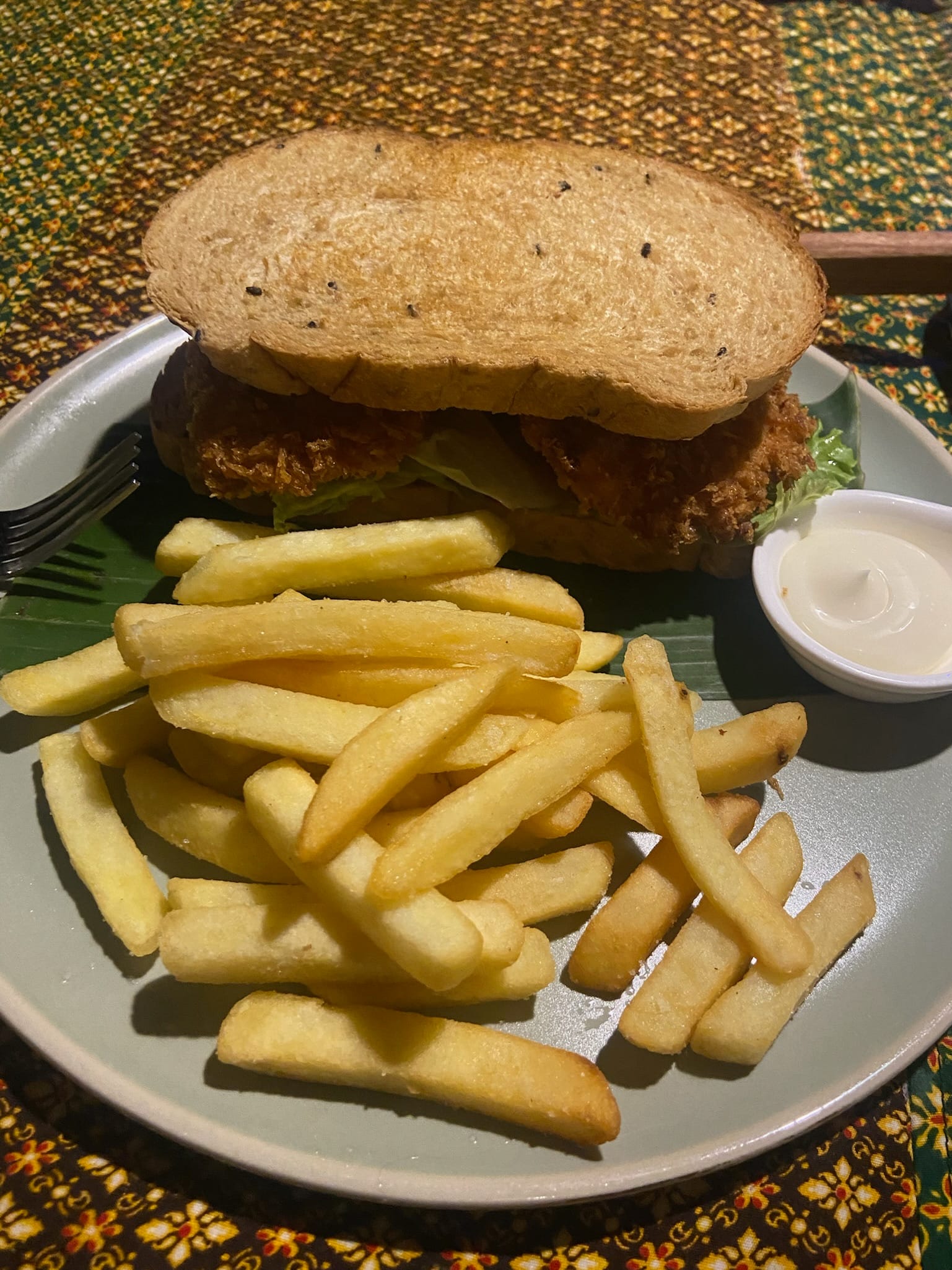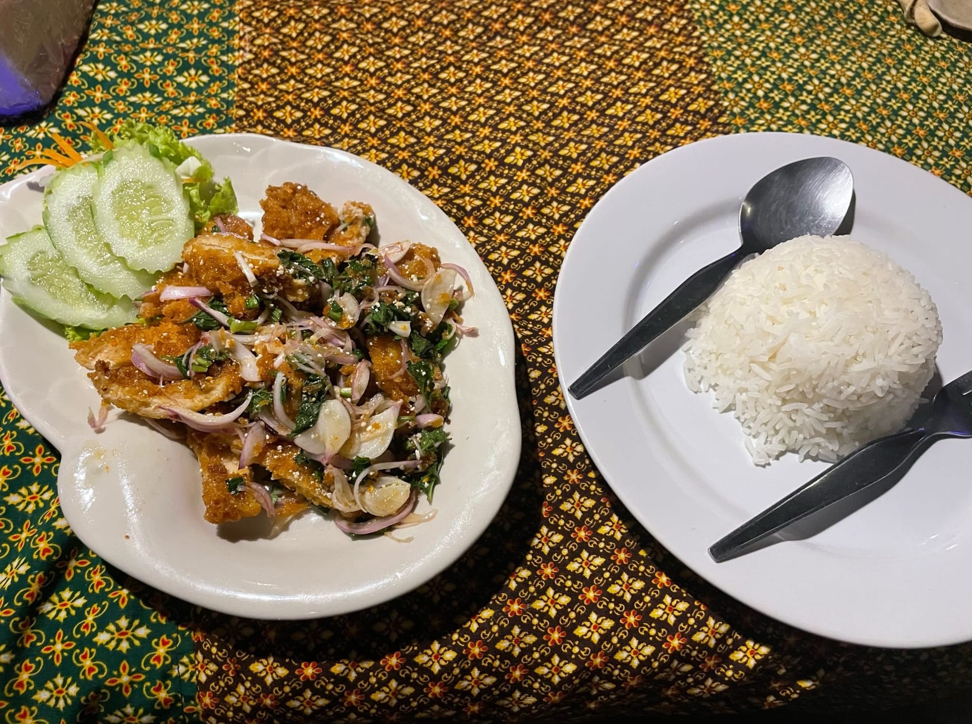 From Where Else Garden: tempura chicken sandwich and chips (Lauryn) and crispy chicken larb which was unbelievably spicy (Dan)