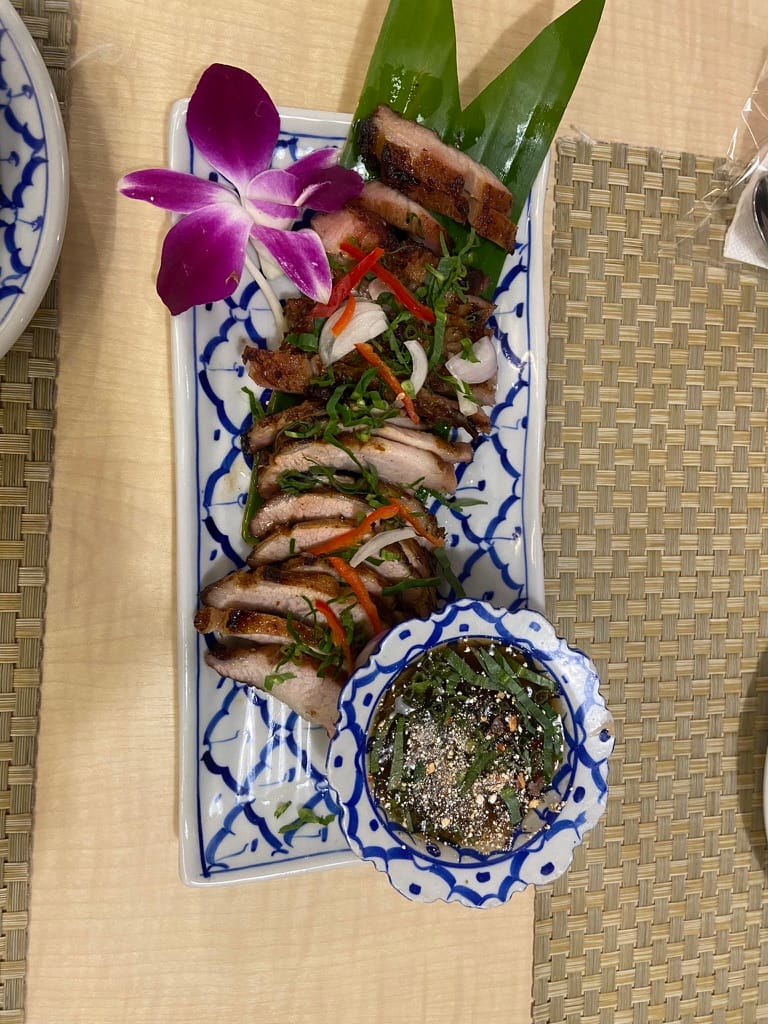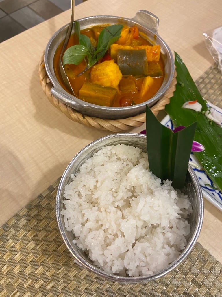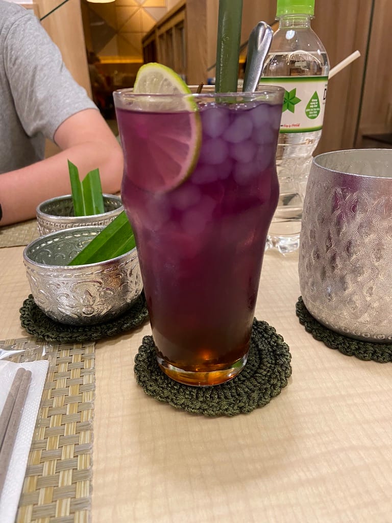 A welcome drink for pandan iced tea - Lauryn is obsessed with pandan now. Buttterfly pea iced tea, vegetable red curry and belly pork .